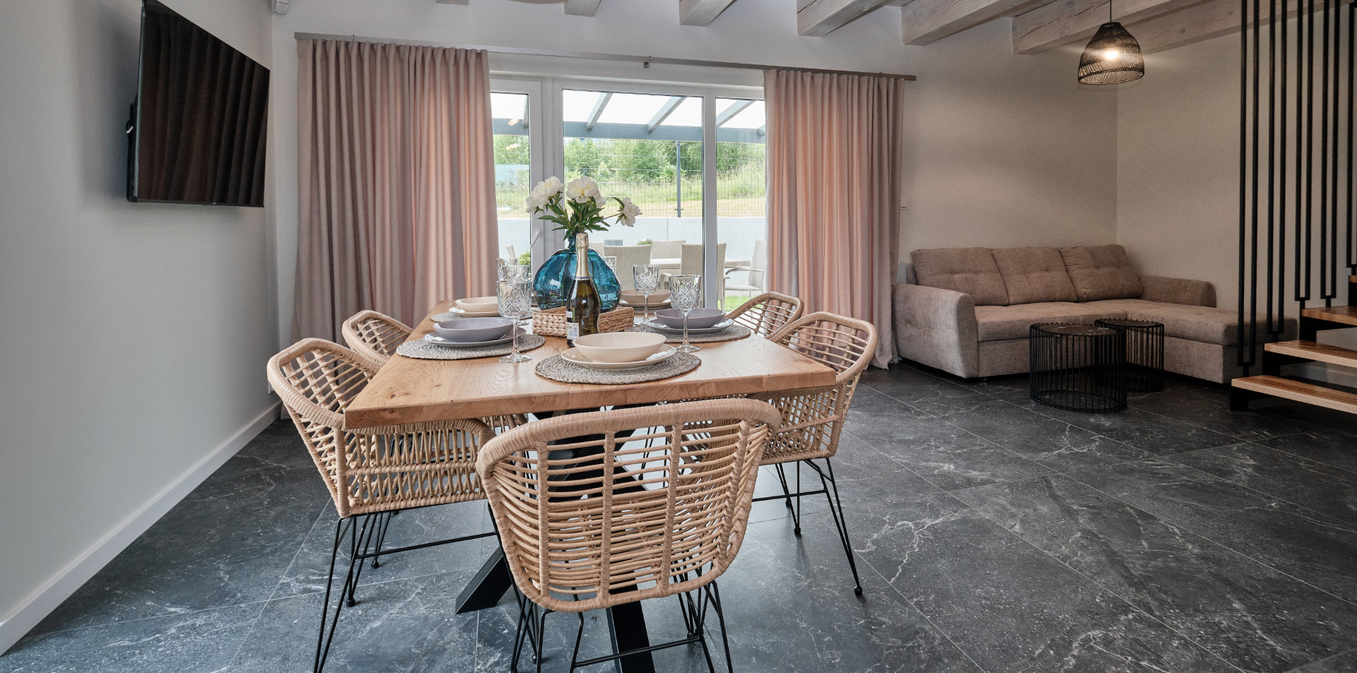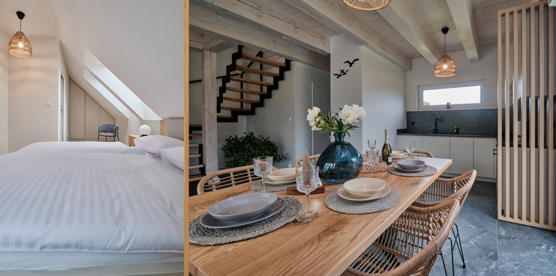 Przedstawiamy Państwu nasze komfortowe apartamenty wakacyjne. Każdy apartament wakacyjny posiada położony na parterze, obszerny salon zawierający część jadalną z dużym stołem, sofą oraz aneks kuchenny, łazienkę z prysznicem oraz znajdujące się na piętrze dwie sypialnie.
